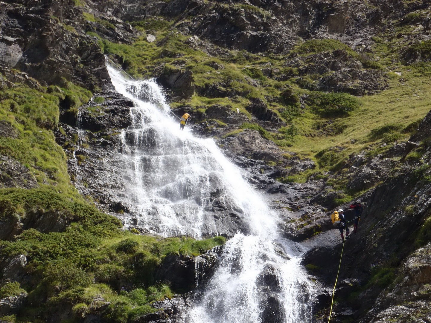 La Larri comienza con un espectacular rápel de 50 m algo arrampado, donde el agua se abre como una cortina cubriendo la negra roca metamórfica.